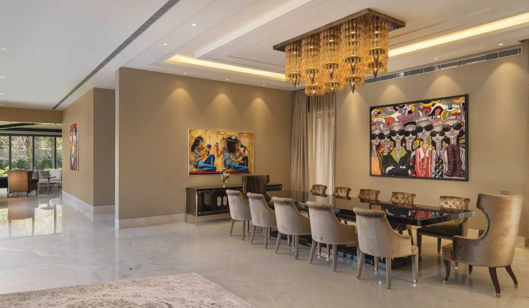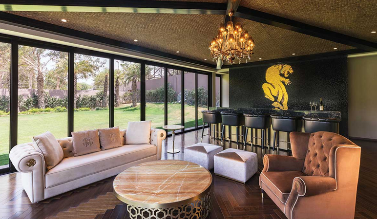 The home boasts a bold and captivating design. The bespoke interiors of the cigar lounge feature a silhouette of a panther elevated on a black mosaic wall. An emerald green crystal shines through the eye of the panther, with the ambient lighting controlled using automation. A metal and stone book leaf design bar table echoes the inventive use of polished materials. In contrast, a coconut shell panelled ceiling and mahogany floor impart warmth. In the waiting area, a real streetlamp stands incongruously against a floral chaise and oversized black planters.