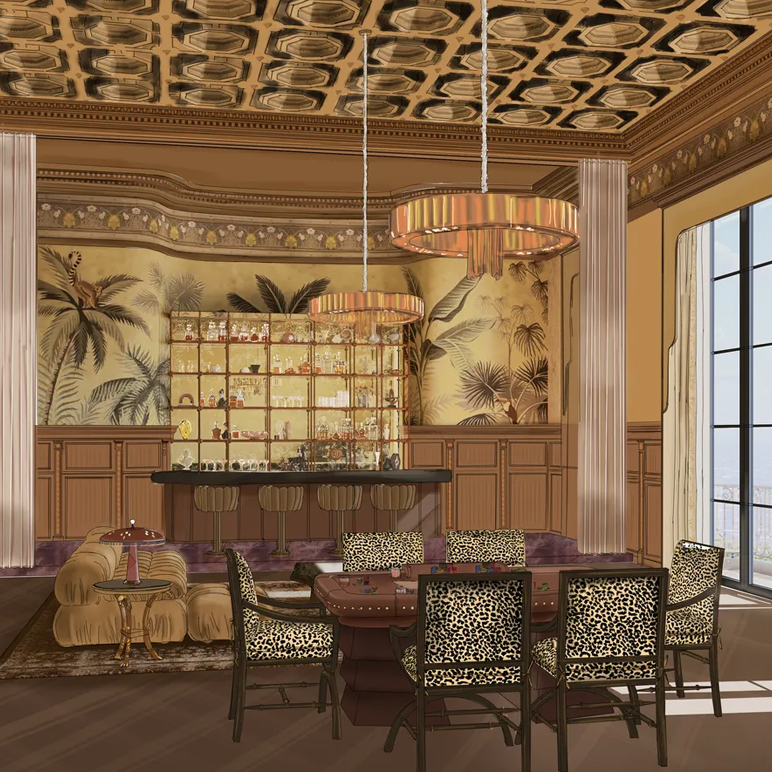 With its open and fluid layout, the lounge seamlessly connects the bar, the entertainment area, and the main seating zone, while still preserving a sense of distinction between them. “The luxurious tones set the mood for a space that balances warmth and sophistication,” she explains. “The poker table anchors the room, while the bar brings in evening energy, where you can stand by the Juliet balcony and see moonlight glint off the sea.”