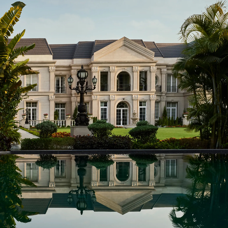Set within a 59,000-square-foot plot, the villa rises from its landscaped lawns like a poised statement. The architecture draws from classical French estates—fluted pilasters, limestone façades, and a mansard roof in deep Astros Blue—yet tempers their formality with lightness. The proportions are measured; the rhythm deliberate. Each façade detail, from Corinthian pilasters to wrought-iron balconies, underscores the home’s quiet grandeur.