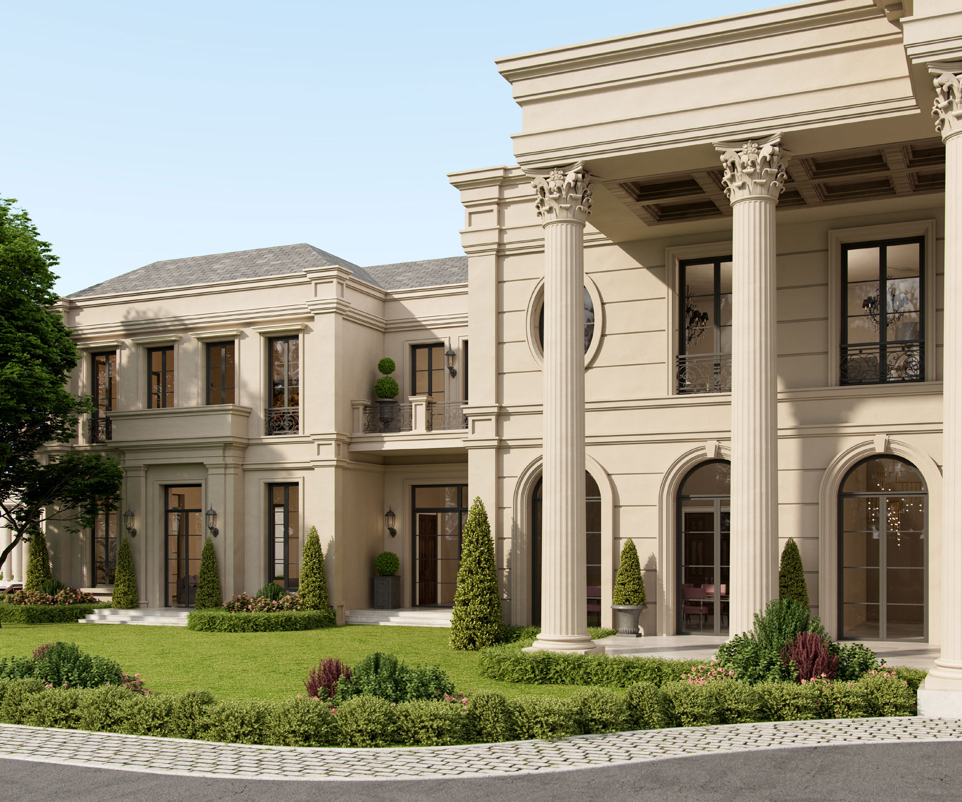 The Ananta Estate is envisioned as a timeless neo-classical residence, where symmetry, monumental colonnades, and sculpted stone façades establish a commanding architectural presence. The residence unfolds through a carefully orchestrated spatial sequence: formal volumes opening into more intimate private realms. The entrance foyer is defined by double-height proportions which creates a moment of arrival marked by a majestic beginning for the user experience. Seven meticulously crafted bedrooms, formal lounges, and retreats are planned to balance volumes and maintain privacy. Responding to the client’s desire for a stately atmosphere yet keeping the home personal and intimate, the project features intricate wooden paneling, curated art pieces, neutral color tones, hand painted wall coverings and marble inlays, resulting in a refined and contemplative retreat that feels both intimate and distinguished.
