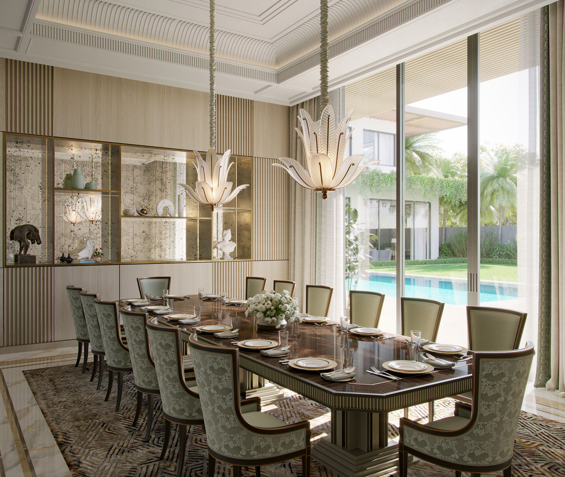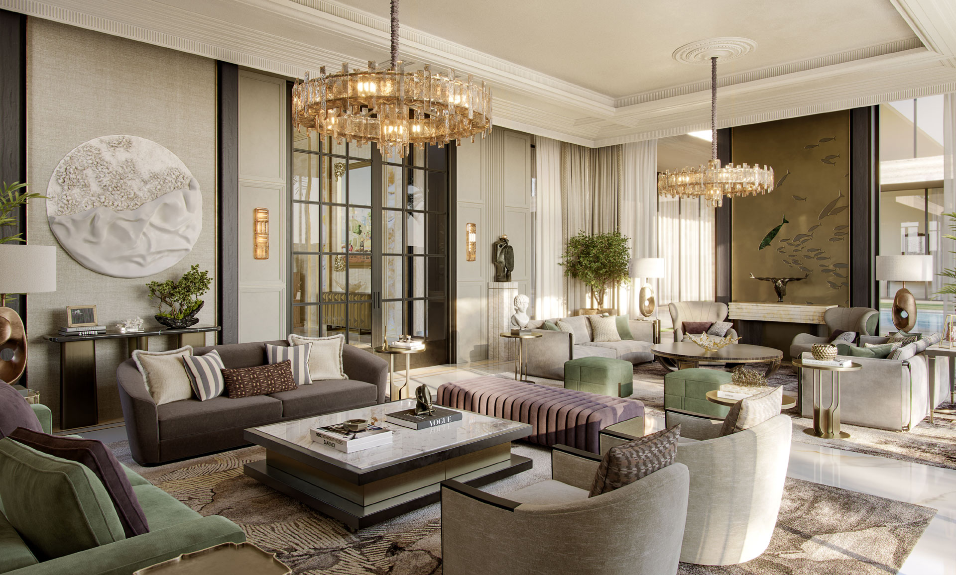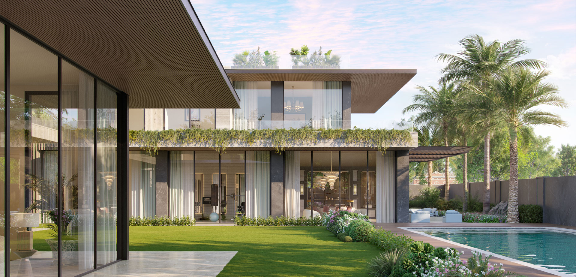 Contextually, the design responds to UAE’s hot climate through a seamless indoor–outdoor relationship. Vulcan wood accents contrast beautifully with travertine, enhancing the façade through a refined interplay of warmth and permanence. Lush palm trees, manicured lawns, and water bodies soften the architecture and create a microclimate that enhances thermal comfort.