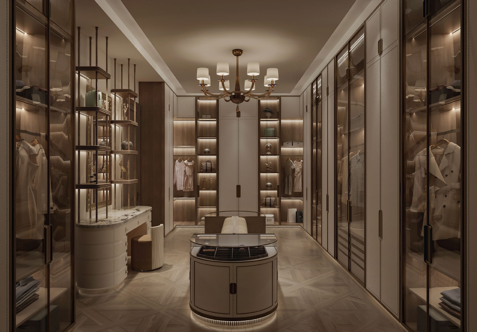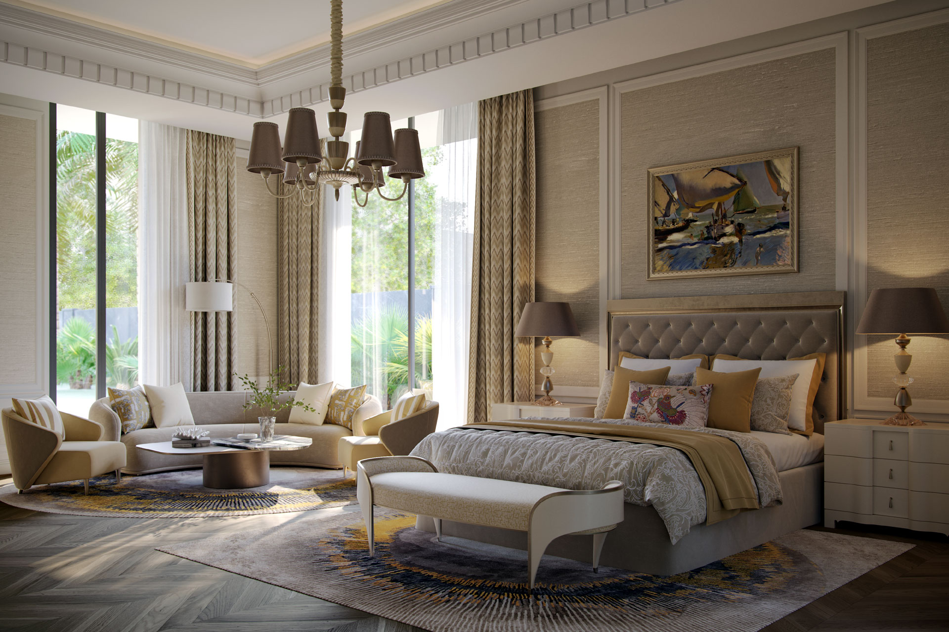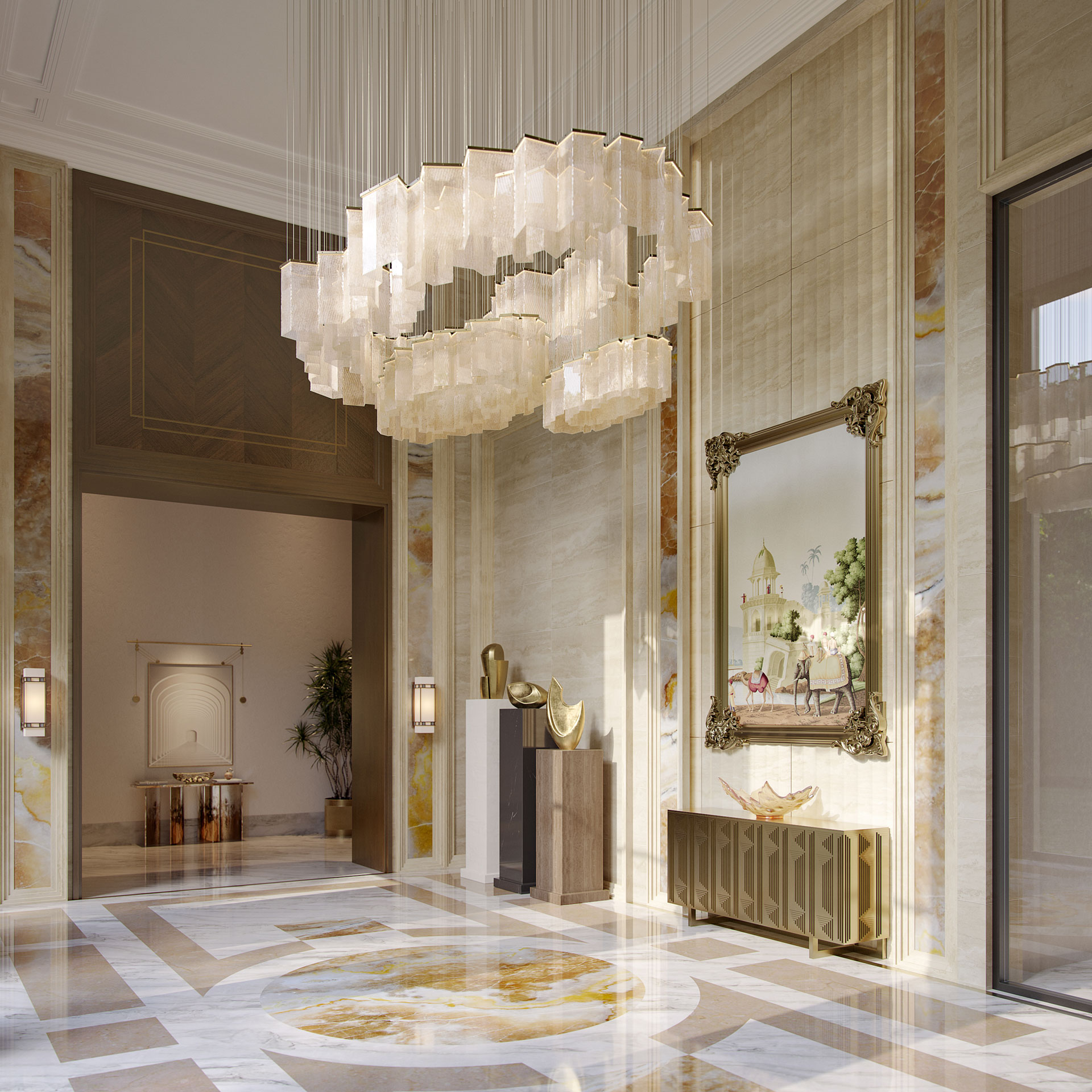 Contextually, the design responds to UAE’s hot climate through a seamless indoor–outdoor relationship. Vulcan wood accents contrast beautifully with travertine, enhancing the façade through a refined interplay of warmth and permanence. Lush palm trees, manicured lawns, and water bodies soften the architecture and create a microclimate that enhances thermal comfort.