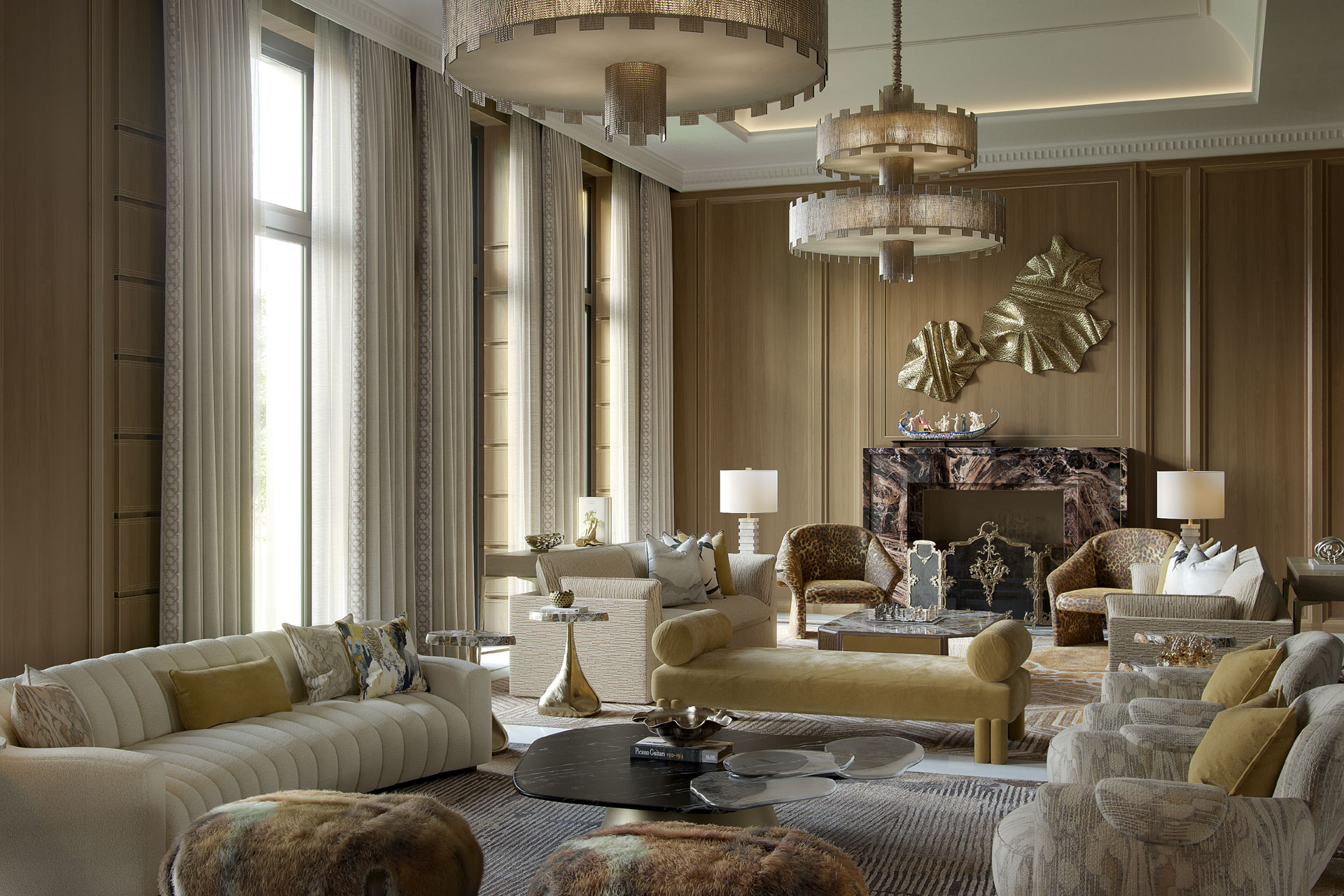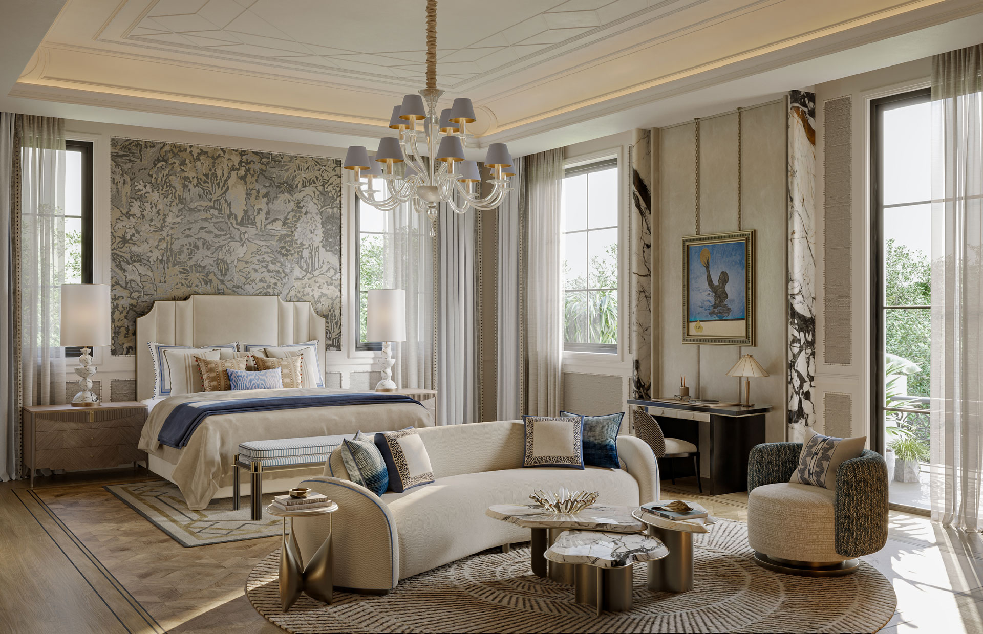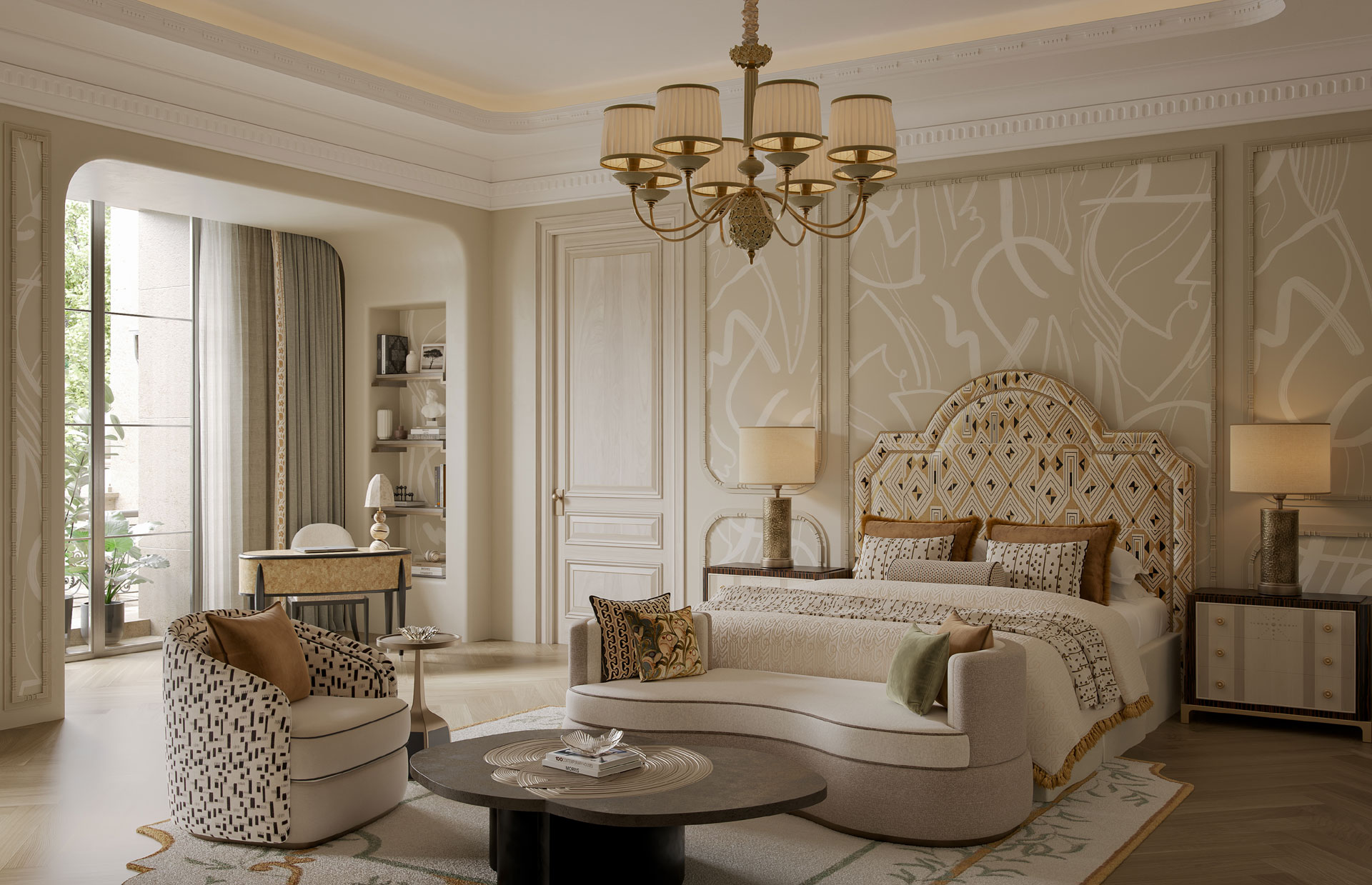 The axial layout is anchored by a sculptural staircase with a delicately patterned wrought-iron railing with brass accents. A cascading crystal chandelier draws the eye upward, amplifying the sense of verticality and light. Paneled walls, character marbles, subtle mouldings, and custom wallcoverings & rugs add depth and texture without overwhelming the space. Play of layered textiles introduce softness, while meticulously detailed decorative light fixtures provide a gentle glow.