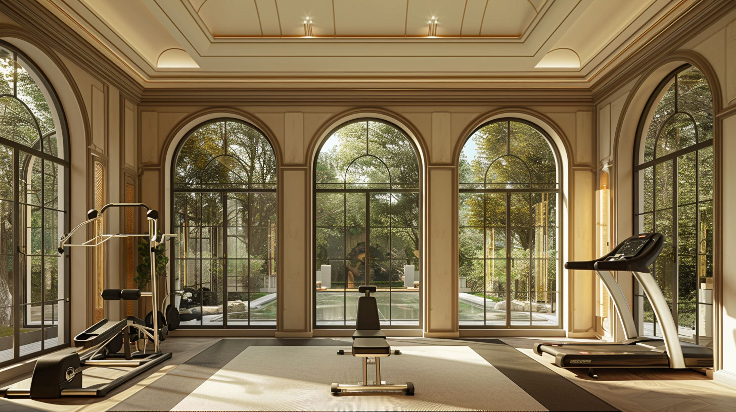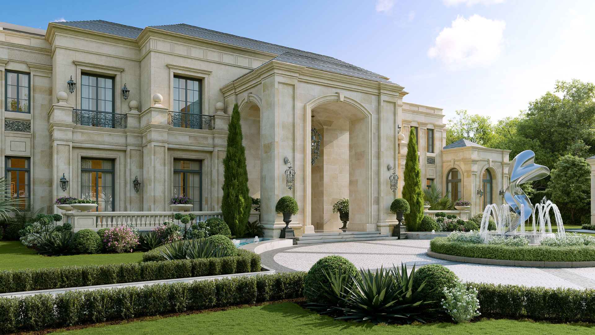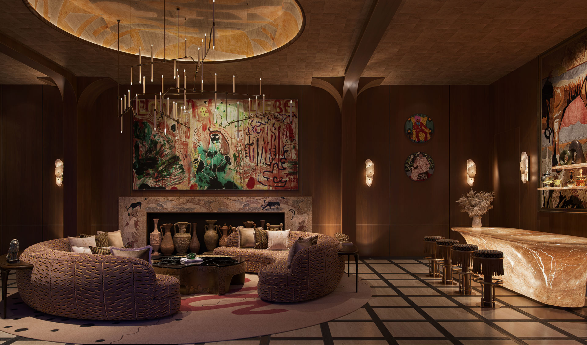 The axial layout is anchored by a sculptural staircase with a delicately patterned wrought-iron railing with brass accents. A cascading crystal chandelier draws the eye upward, amplifying the sense of verticality and light. Paneled walls, character marbles, subtle mouldings, and custom wallcoverings & rugs add depth and texture without overwhelming the space. Play of layered textiles introduce softness, while meticulously detailed decorative light fixtures provide a gentle glow.
