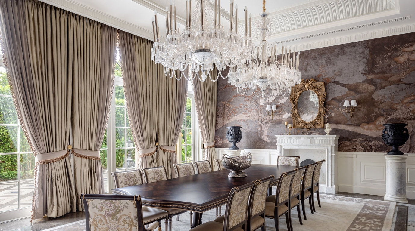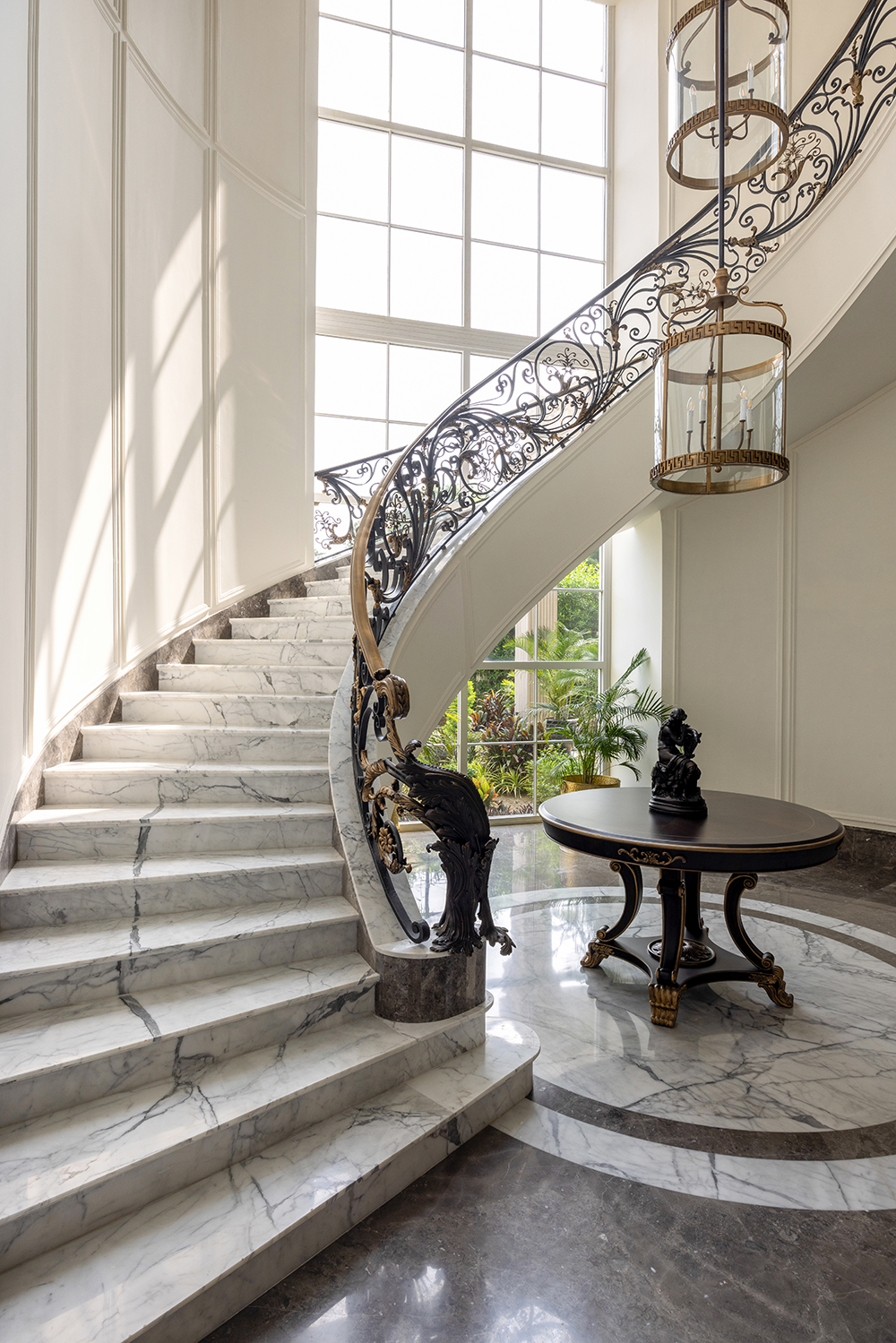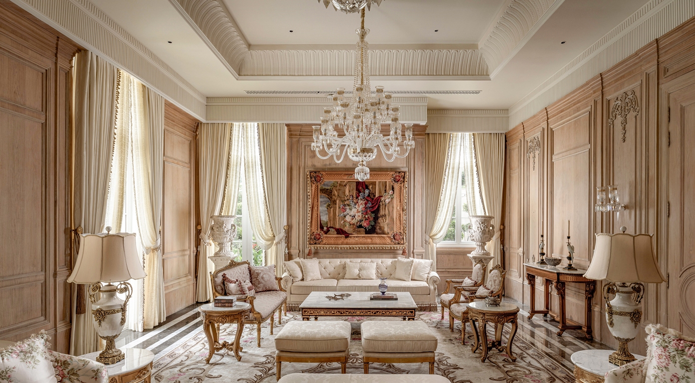 The design approach emphasizes precision over ornamentation. Ferragamo Beige limestone lends the exterior a warm, sun-washed character, while interiors unfold through marble inlays, champagne-leafed ceilings, warm wood paneling, and handcrafted metalwork. Material richness is expressed through stone skirtings, carved boiserie, hand-blown glass fixtures, and bronze accents creating moments of quiet luxury. Integrated automation subtly enhances comfort, allowing the classical envelope to support contemporary living. Landscaped lawns, terraces, and a poolside cabana amalgamate architecture with nature, using light, water, and greenery as living design elements. Oaklane Villa ultimately achieves a poised equilibrium between heritage, craft, and serene modernity.