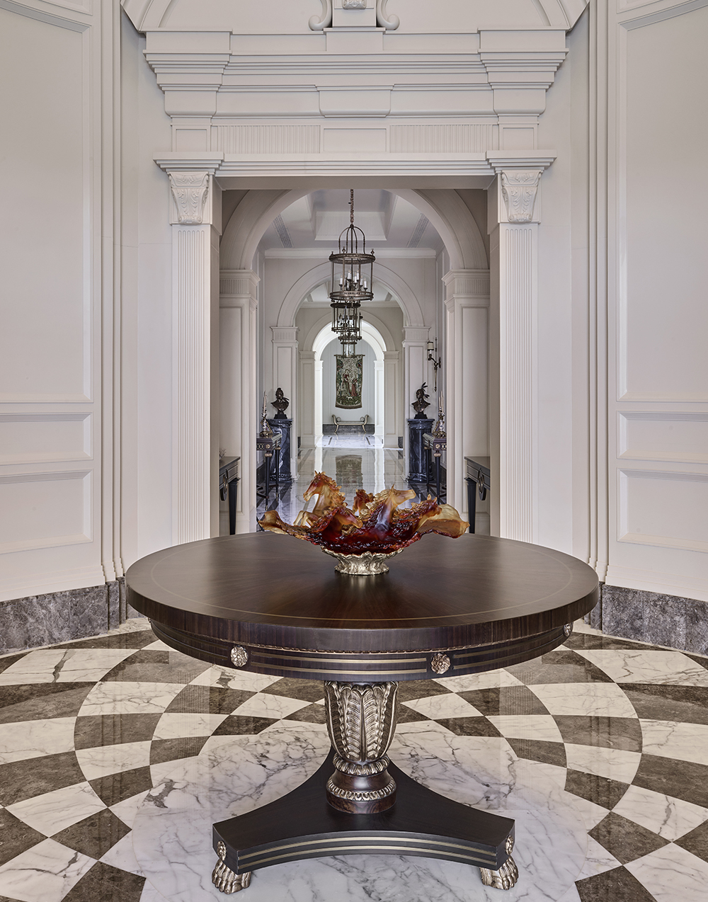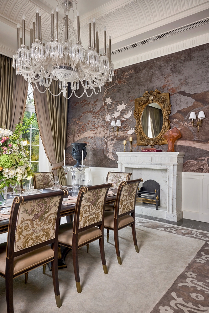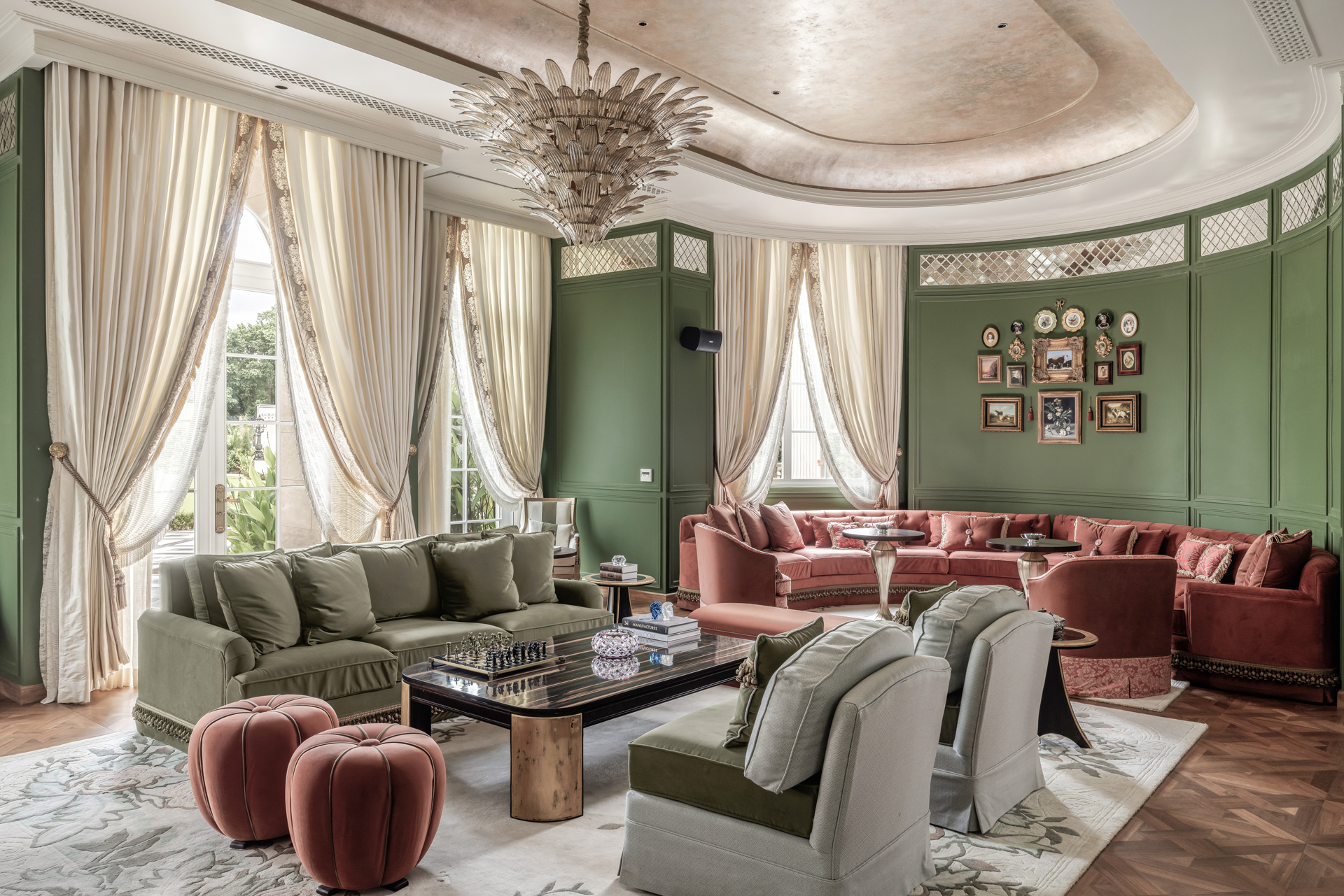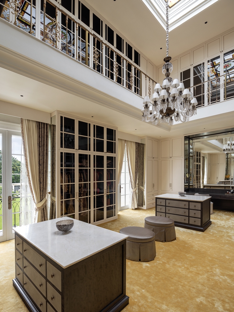 The design approach emphasizes precision over ornamentation. Ferragamo Beige limestone lends the exterior a warm, sun-washed character, while interiors unfold through marble inlays, champagne-leafed ceilings, warm wood paneling, and handcrafted metalwork. Material richness is expressed through stone skirtings, carved boiserie, hand-blown glass fixtures, and bronze accents creating moments of quiet luxury. Integrated automation subtly enhances comfort, allowing the classical envelope to support contemporary living. Landscaped lawns, terraces, and a poolside cabana amalgamate architecture with nature, using light, water, and greenery as living design elements. Oaklane Villa ultimately achieves a poised equilibrium between heritage, craft, and serene modernity.