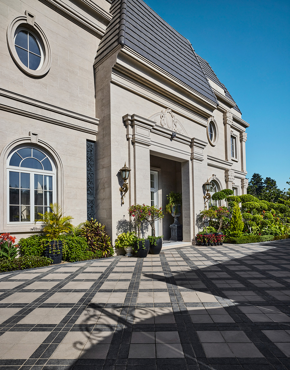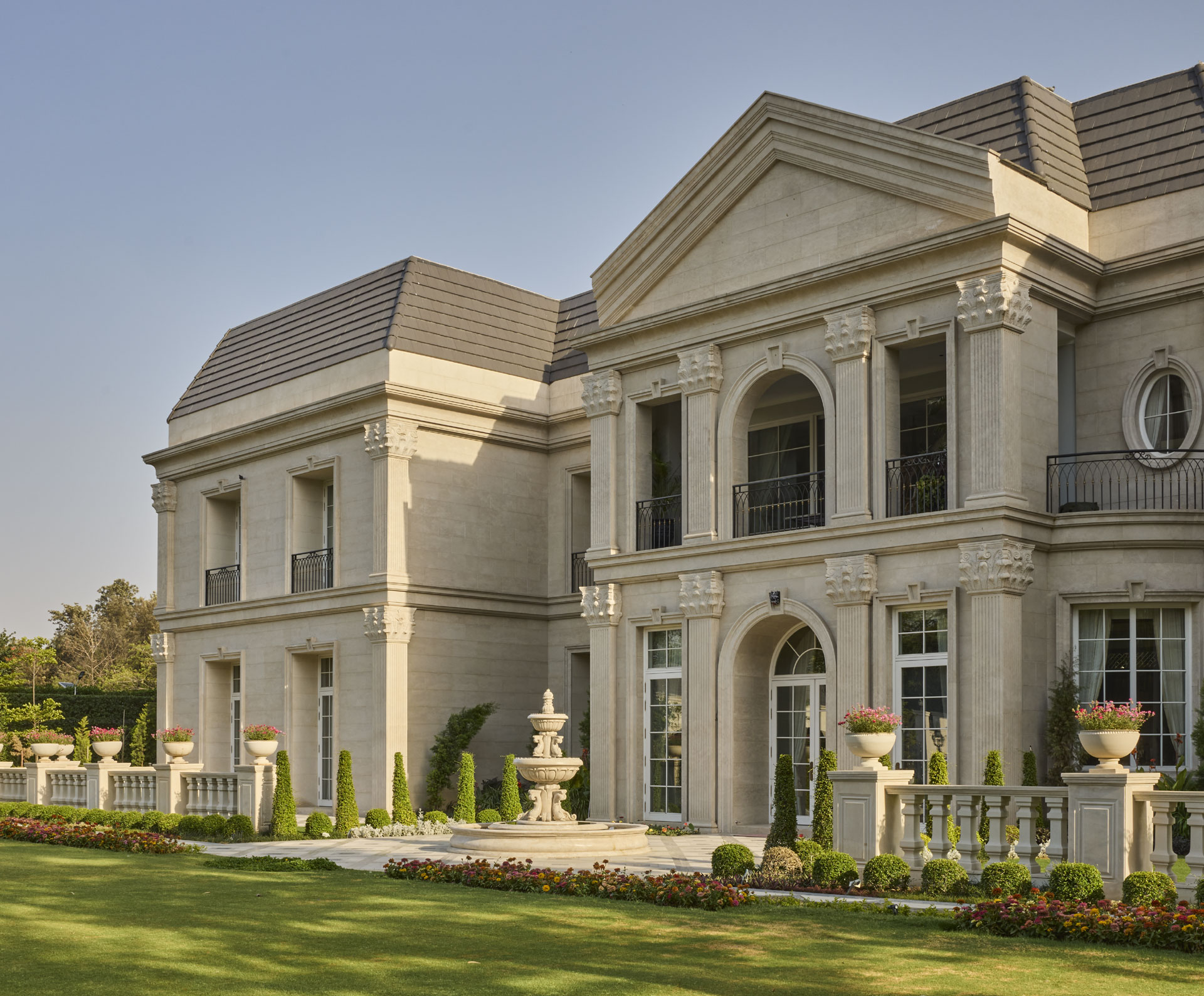 Oaklane Villa situated in a quiet enclave of Delhi, reinterprets the grandeur of a French château through a contemporary Indian lens. Designed for a well-travelled family of travelers and collectors, the home balances classical European architecture with modern way of living. The villa’s architecture draws from French estates fluted and Corinthian pilasters, limestone façades, wrought-iron railings, and a mansard roof finished in deep Astros Blue tiles composed with deliberate proportions and softened formality.