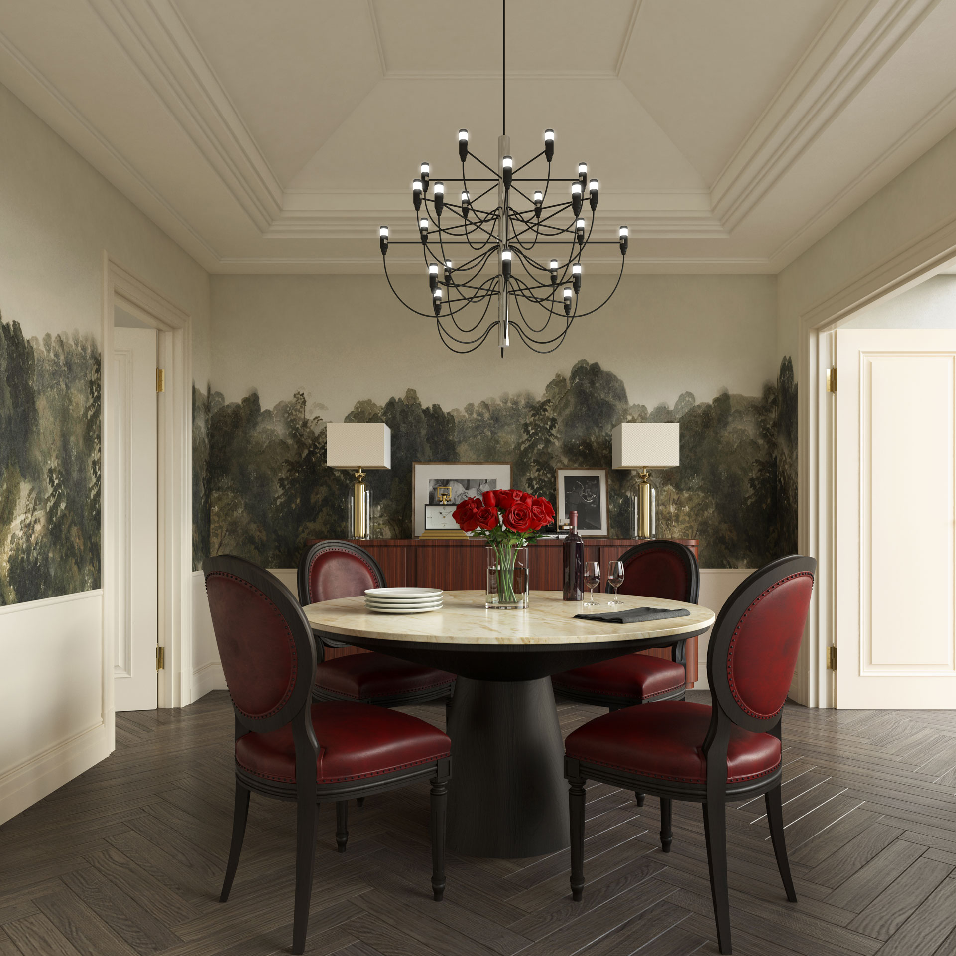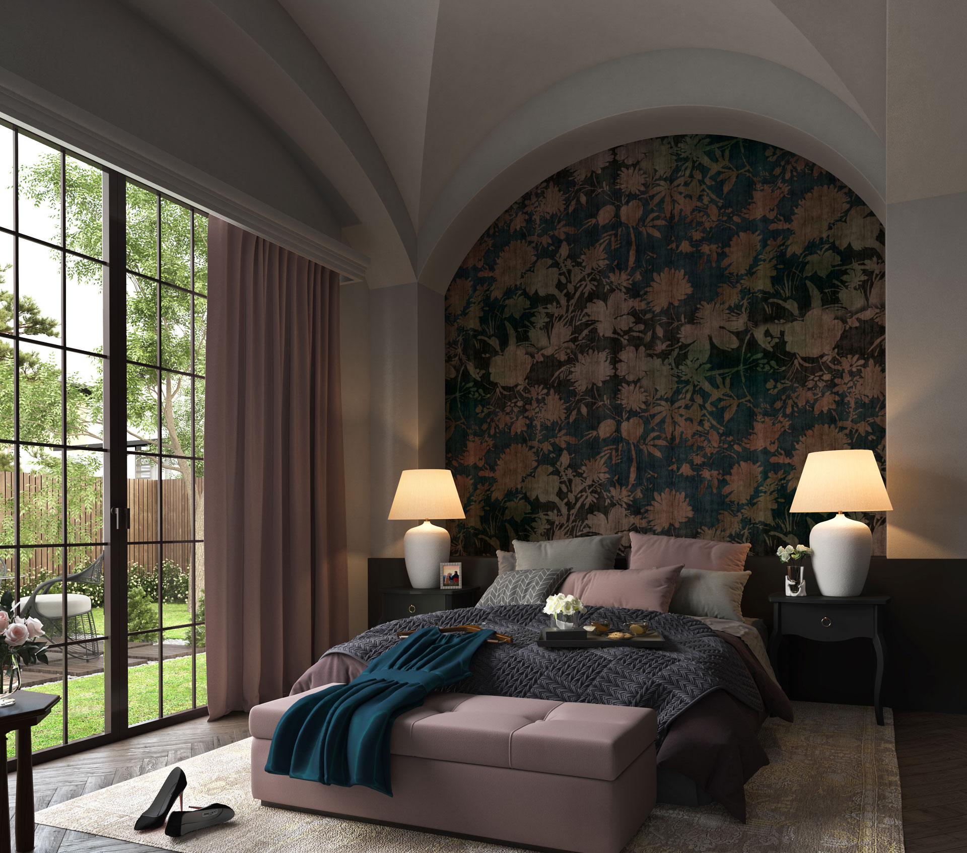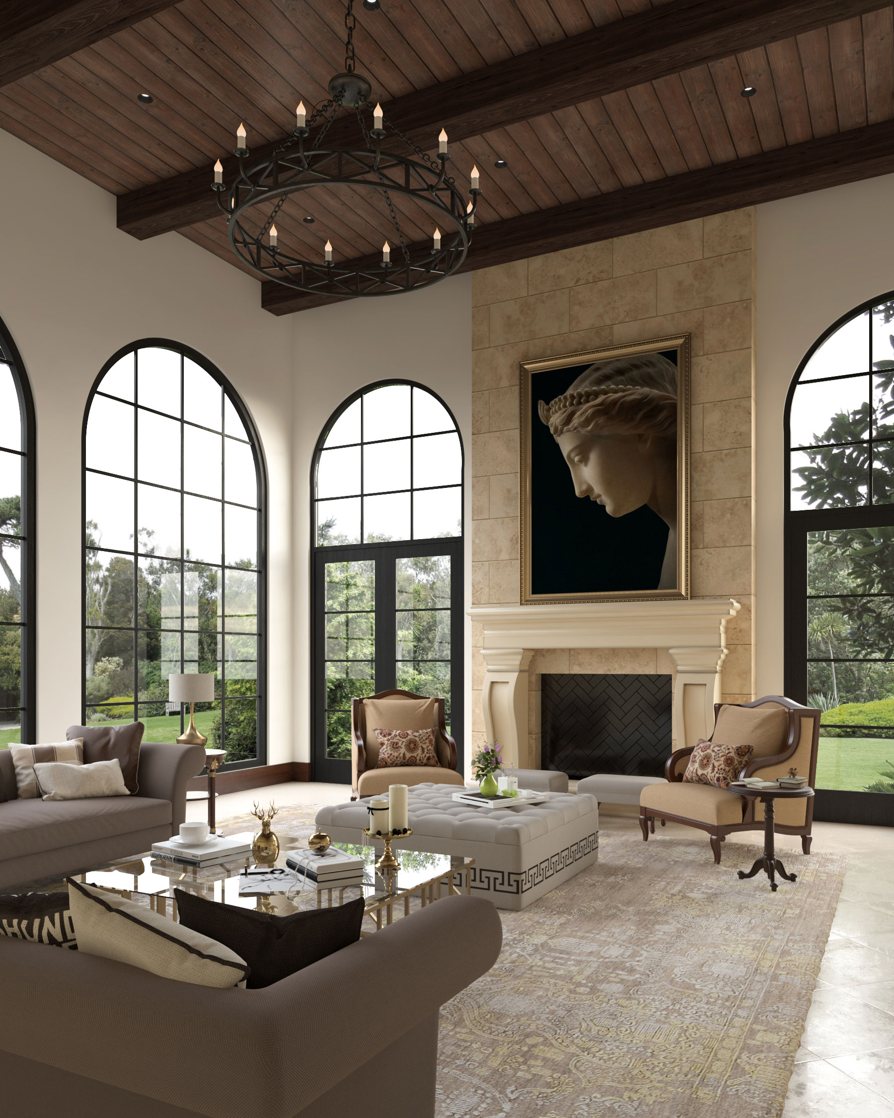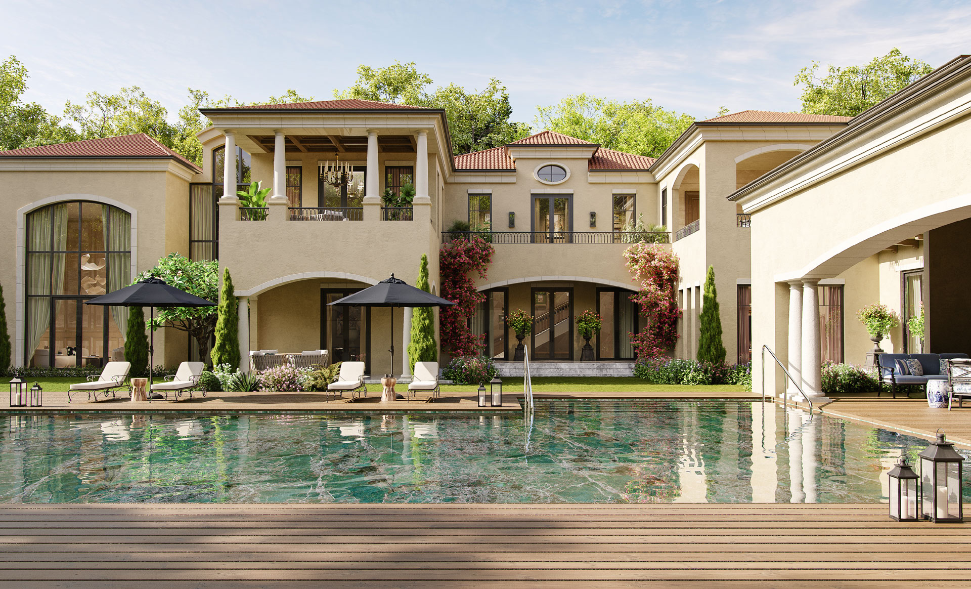 Rooted in Spanish Colonial Revival architecture, this villa is defined by stucco finish façades, terracotta roofs, and rhythmic arches that shape its timeless character. The planning unfolds around a central courtyard and pool, encouraging seamless indoor–outdoor living. Vaulted ceilings, exposed timber beams, and textured finishes create a layered warmth, while filtered light, water reflections, and garden vistas immerse the user in a calm, gracious, and enduring Mediterranean way of life.