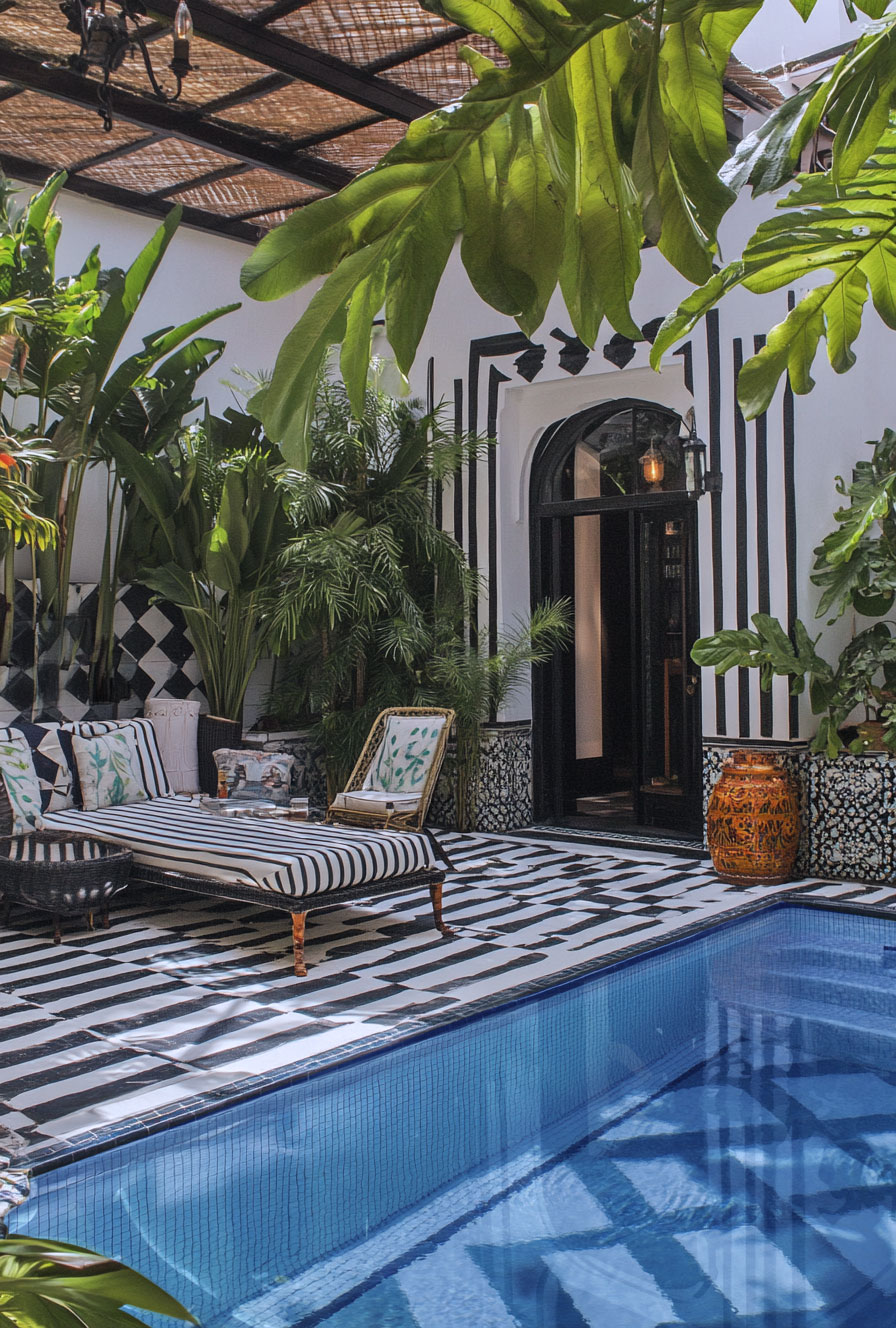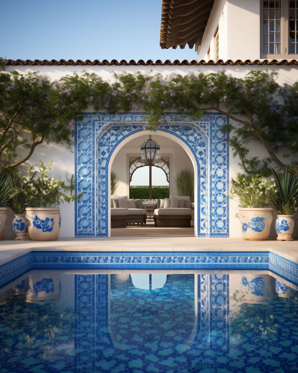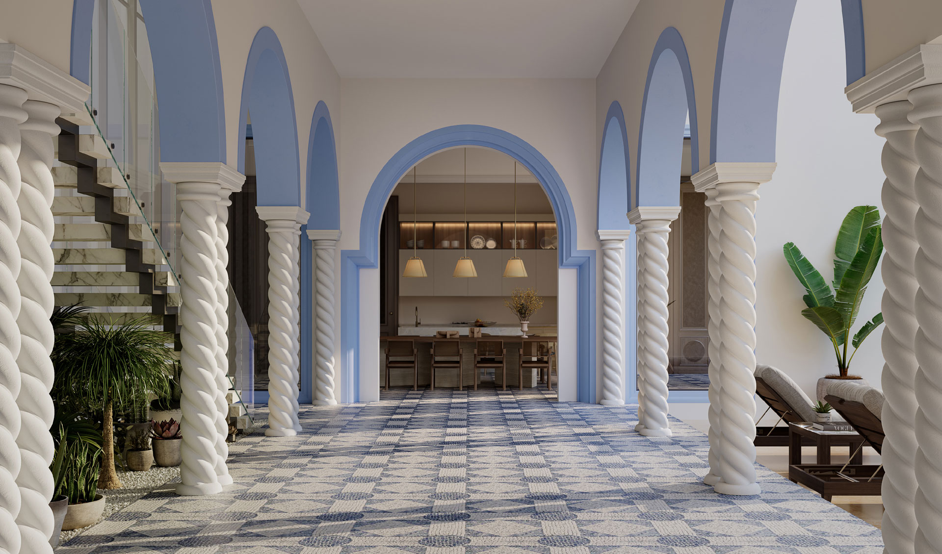 Villa Mallorca a Mediterranean-inspired architectural language thoughtfully adapted to Goa’s tropical coastal climate. On the exterior, arched portals, lime-plastered walls, terracotta roof tiles, and hand-painted blue porcelain tiles echo Southern European aesthetics, additionally shaded courtyards, deep verandas, and a pool-centric layout respond naturally to Goa’s hot, humid conditions. Lush planting, climbing vines, and ceramic planters soften the built form, creating a cool, breezy environment where water, shade, and greenery work together to temper heat and invite outdoor living.